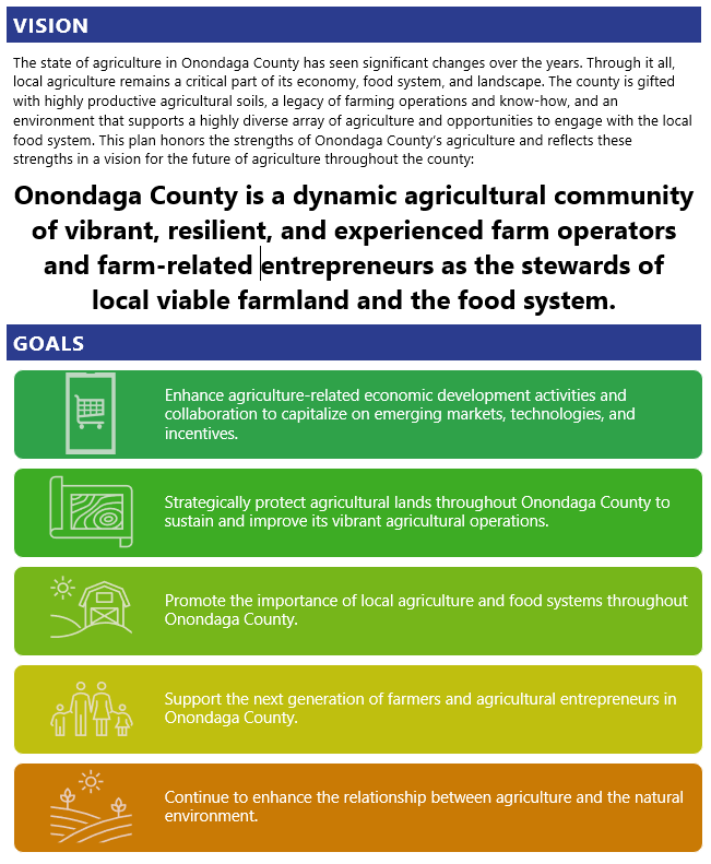 The Onondaga County Agriculture & Farmland Protection Plan is the result of research, review, and community discussion on the state of local agriculture and what actions can best support local farm operations and the local agricultural land base. This plan is intended to guide Onondaga County legislative policy and the work of its Agriculture and Farmland Protection Board (AFPB) and the County's agricultural planning programs. It is also intended as a resource for the many towns and villages in Onondaga County, each with their own unique relationship with agriculture, for our important agricultural program partners, and of course, for the County's 600+ agricultural businesses.